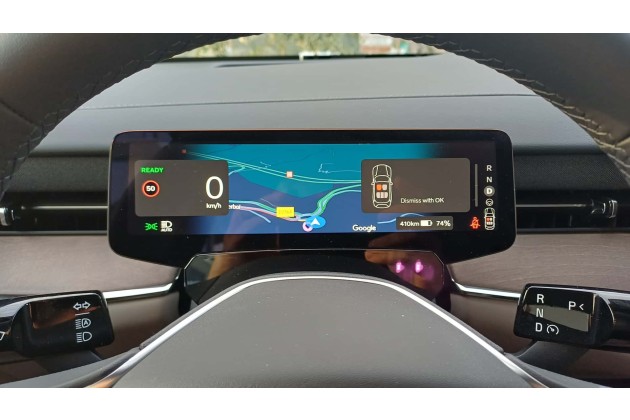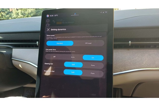 Der Touchscreen zeigt oben die Navigationskarte, darunter ein paar Widgets für die Medienbedienung und dergleichen. Dann folgt eine kontextabhängige Icon-Leiste, mit der beim Fahren das One-Pedal-Driving aktiviert und Fahrwerkseinstellungen gemacht werden können, und schließlich eine stets gleichbleibende Leiste mit Klimaeinstellungen. Als Betriebssystem wird Android Auto verwendet, sodass Google Maps und Google Assistant zur Verfügung stehen. Sah man bei Volvo früher auf ein graugrüne Navigationskarten, so blickt man nun auf prächtige Satellitenbilder.