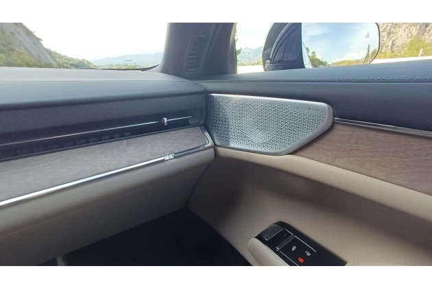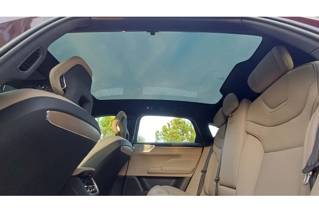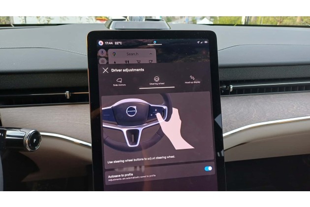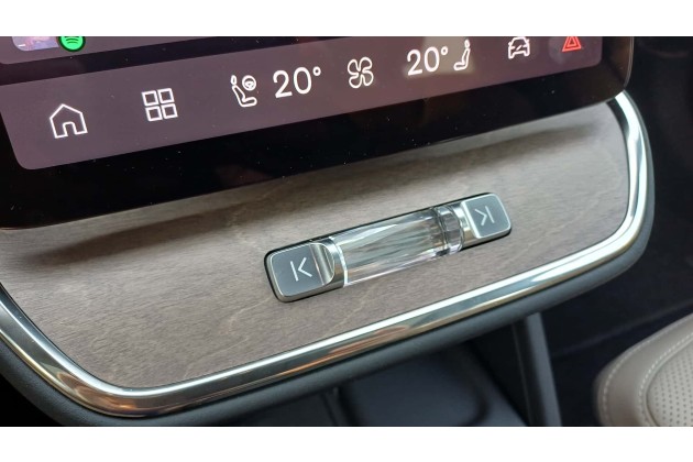 Im Interieur verzichtet Volvo größtenteils auf physische Bedienelemente. So müssen die Außenspiegel und die Position des Lenkrads per Touchscreen und Lenkrad-Tasten eingestellt werden. Es gibt allerdings ein Röllchen aus Kristallglas für die Lautstärke und zwei Pfeiltasten, mit denen man zum nächsten Audio-Track springen kann.
