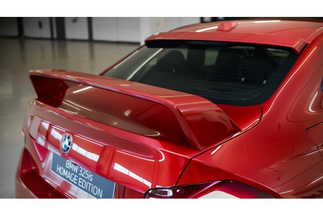 Die Homage-Modelle bleiben technisch unverändert, tragen jedoch stilistische Elemente, die an die Originale erinnern. Der BMW 325iS Homage ist mit einem Doppelschweller-Heckspoiler, Rädern im Heritage-Stil, dem M Sport Pro-Paket, M Sportsitzen, einem Frontsplitter, einer Armlehne mit originalem Überkaro-Tartanbezug der zweiten Generation, schwarzen Türgriffen und einer Gedenktafel (1 von 33) ausgestattet. Die Farbpalette umfasst Mineral White, Sapphire Black, Skyscraper Grey und Fire Red.