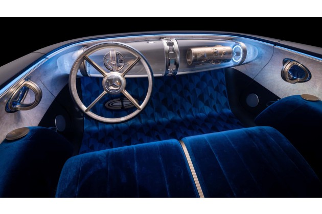 Das Vierspeichen-Lenkrad sieht aus wie aus einer Luxuslimousine der 1930er Jahre, mit einem Marken-Logo, das in einer Glaskugel schwebt. Bemerkenswert zudem: Das Lenkrad ist nicht physisch mit den Vorderrädern verbunden, das Elektrokonzept verfügt über Steer-by-Wire. Der Verzicht auf eine Lenksäule ermöglichte es den Designern, sich bei der Gestaltung des Innenraums auszutoben, und das sieht man.