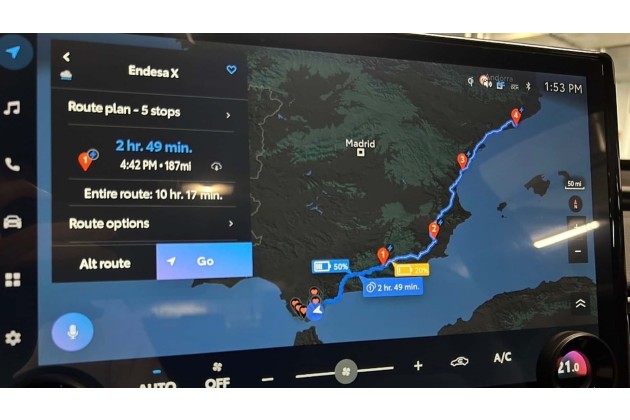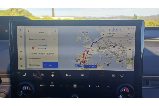 Auch das Ergebnis war wenig befriedigend: Das System zeichnete neun Ladestopps zwischen Malaga und Zentralfrankreich ein, dann kam lange nichts mehr, bis Hamburg, das als zehnter Stopp angezeigt wurde. Außerdem handelt es sich offenbar nur um eine Liste von Schnellladern auf der Strecke, nicht um eine Empfehlung. Es fehlen auch Angaben dazu, von welchem Ladestand bis zu welchem SoC man laden soll und weitere Daten, zum Beispiel zur Ladeleistung. Das System beschränkt sich darauf, die Entfernung zur aktuellen Position anzuzeigen.
