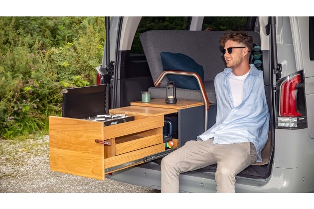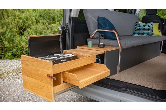Die Vansports Camping-Box für Vito und V-Klasse verwandelt den Innenraum im Handumdrehen in eine Mini-Wohnlandschaft. Das modulare System besteht aus einem stabilen Aluminiumrahmen mit hochwertigen Holzblenden, integrierten Auszügen und cleveren Stauräumen. Es ist komplett werkzeuglos montierbar und lässt sich ebenso schnell wieder entfernen, wenn der Van wieder als Transporter genutzt werden soll.