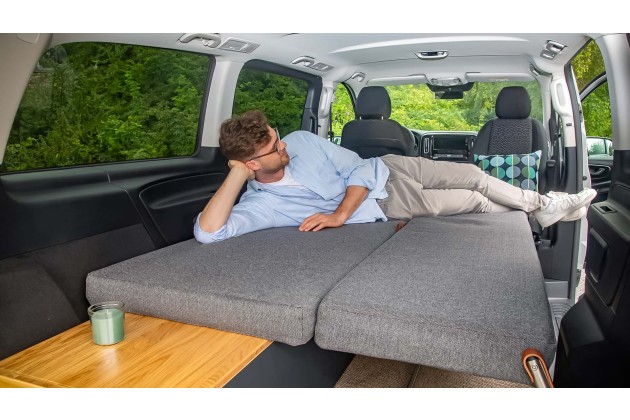 In Kombination mit der optionalen Matratze entsteht eine Liegefläche von rund 195 x 125 Zentimetern - ausreichend Platz für zwei Erwachsene und den spontanen Wochenendtrip. Ergänzend stehen Küchenmodule mit Gaskocher, Spüle und Frischwasserkanister bereit, womit der Vito endgültig in die Camperliga aufsteigt.