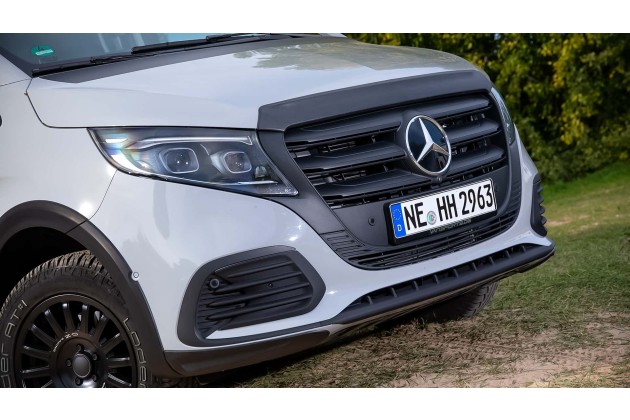 Beim aktuellen Umbau konzentriert sich Vansports aufs Grobe mit Stil: Schwarze Protectorlack-Elemente an Motorhaube, Kühlergrill und Frontschürze unterstreichen den bulligen Auftritt. Der Kammeinsatz im Grill, flankiert von robusten Radlaufaufsätzen und mattschwarzen Edelstahl-Seitenrohren, verleiht dem Vito eine Portion Wildnis, die man sonst eher von Offroadern mit Stern auf der Haube kennt.