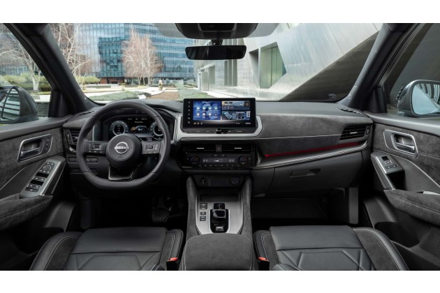 Der aktualisierte Nissan behält ein schlichtes Armaturenbrett bei, jedoch mit hochwertigeren Materialien. Die Grafik der Displays wurde erneuert und die Bezüge können je nach Ausstattung technische Stoffe, Alcantara oder Leder/Stoff-Kombinationen umfassen. Das zentrale Multimediasystem misst 12,3 Zoll, ebenso wie das digitale Instrumentendisplay.
