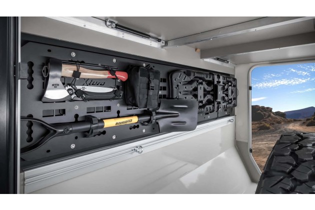 Auch an den Inhalt hat Kreavans gedacht: In der Heckgarage liegen ein Rescue- und ein Recovery-Kit bereit, komplett mit Sandboard, Kompressor, Werkzeug und Säge. Praktisch, falls der Offroad-Trip mal wortwörtlich stecken bleibt.