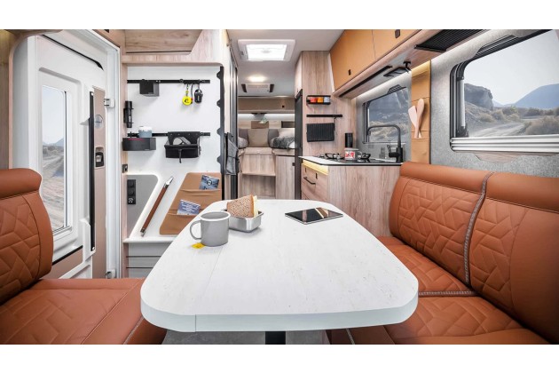 Technisch bleibt es bei bewährtem Sprinter-Fundament: 190 PS, zuschaltbarer Allrad, winterfester Aufbau, Lithium-Batterie, Solarpanels, Dieselheizung und Touchpanel-Steuerung für Licht und Klima. Alles auf dem Stand moderner Reisemobile, nur eben mit deutlich mehr Bodenfreiheit und weniger Angst vor Schlammlöchern.