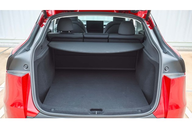 Der Kofferraum ist riesig, inklusive tiefem Unterbodenfach. Weniger überzeugend zeigt sich die Kofferraumabdeckung. Sie ist als Faltlösung konstruiert, funktioniert in der Theorie gut, ist in der Praxis aber hakelig, klappert und ist nur schwer mit einer Hand zu bedienen. Beim Öffnen der Heckklappe fällt außerdem auf, dass diese extrem weit ausschwingt - inklusive Spoiler. Gut für Großgewachsene, aber in niedrigen Garagen oder Parkhäusern kann das schnell eng werden.