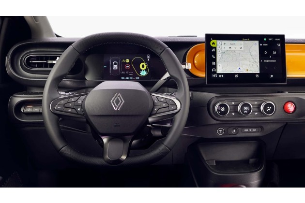 Auch das Cockpit des Twingo sieht anders aus als bei R4 und R5. Während die großen Brüder jeweils zwei 10-Zoll-Displays direkt nebeneinander haben, bekommt der Kleinstwagen stets ein 7-Zoll-Instrumentendisplay und einen 10-Zoll-Touchscreen. Allerdings besitzt die Basisversion Evolution kein Navigationssystem; hier soll man stattdessen das eigene Smartphone über Apple CarPlay oder Android Auto koppeln und damit navigieren.