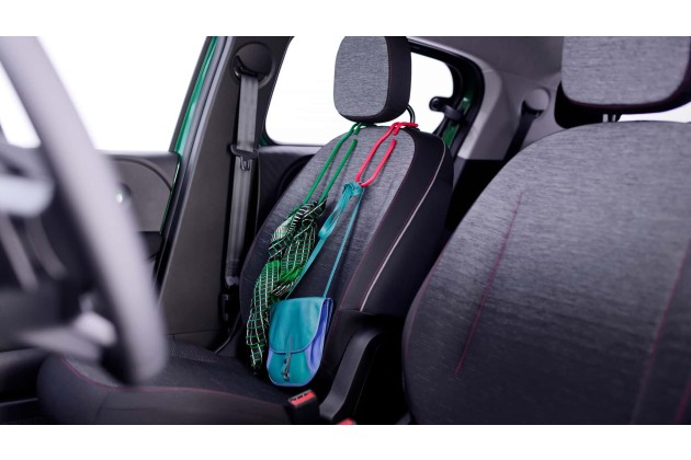 Wie der Dacia Spring Electric erhält auch der Twingo das clevere YouClip-System. Es gibt einen Befestigung im Fußraum vor dem Beifahrersitz sowie zwei im Kofferraum. Mit Letzteren lässt sich die Laderaumabdeckung befestigen oder Einkaufstüten fixieren. Ebenfalls pfiffig sind die Haken, mit denen sich Taschen verschiedener Größen an der Beifahrersitz-Kopfstütze befestigen lassen.