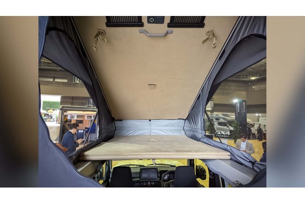"Durch die Installation des Aufstelldachs entsteht ein Schlafplatz auf dem Fahrzeugdach. So kann man zu abenteuerlichen Reisen mit dem Jimny aufbrechen, ohne das Auto verlassen zu müssen. Das Dachbett, das speziell für das Aufstelldach des Jimny Nomad konzipiert ist, bietet als geräumiges Flachbett eine Liegefläche von 202 × 108 cm. Mit dem Jimny war dies bisher nicht möglich. Es entsteht ein Rückzugsraum, in dem man sich ausruhen und die Freiheit genießen kann, sich nach Belieben zu bewegen."