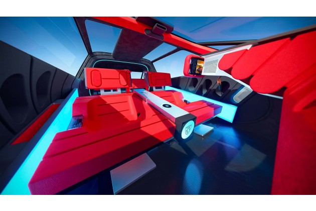 Das Concept-Car besteht auch aus weniger Teile als ein herkömmliches Fahrzeug. wodurch es leichter wird, und einfacher zu produzieren und nach der Nutzung zu recyceln ist. Der im Interieur verwendete Lack enthält Bestandteile aus Altreifen. Boden, Decke, Türverkleidungen usw. sind mit einem Textil aus recycelten Sitzen verkleidet.
