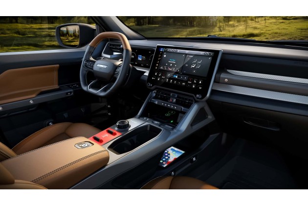 Die Mittelkonsole ist zweigeschossig, mit einer Schale zum kabellosen Handy-Laden oben und einer Kabeldurchführung zu dem Staufach unten, das sich für Tablets, Geldbörsen und anderes eignet. Serienmäßig gibt es zudem ein Premium-Audiosystem von Alpine. Die Lautsprecher befinden sich nicht in den Türen, sondern unter den Sitzen, wodurch man auch bei demontierten Türen Musik genießen kann. Der Kofferraum fasst bei umgeklappten Rücksitzen bis zu 1.866 Liter; dazu kommt ein 84 Liter großer Frunk.