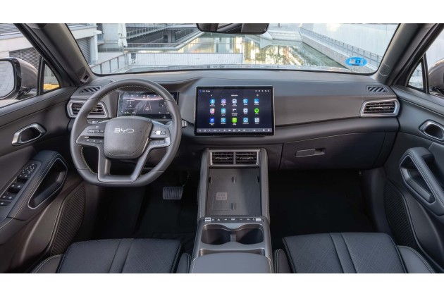 An den Außenabmessungen ändert sich nichts. Es gibt jedoch kleine Unterschiede bei der Optik: Die Zierelemente an den Vordertüren wurden entfernt, und an der Heckklappe gibt es andere Embleme, darunter ein zentrales BYD-Logo. Innen gibt es sechsfach elektrisch verstellbare Vordersitze sowie eine Sitz- und eine Lenkradheizung. Die Mittelkonsole enthält zwei Getränkehalter und eine Armlehne, die sich öffnen lässt. In der Nähe des Armaturenbretts befindet sich ein Bedienfeld mit physischen Tasten für Fahrzeugfunktionen wie die Scheibenheizung, die Audio-Lautstärke und die Fahrmodi Eco, Normal, Sport und Snow. Außerdem gibt es ein Panorama-Glasdach.
