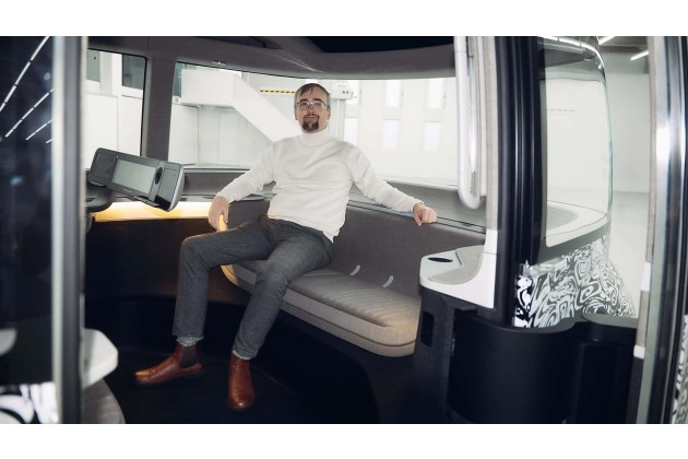 Der Innenraum nutzt hochwertige, recycelbare Materialien wie Arfinio und 3D-gedruckte Sitzpolster von Covestro. Alle autonomen Komponenten sind in einer modularen "Tech-Rack"-Architektur zusammengefasst, die schnelle Updates und Wartung ermöglicht. Auffallend ist natürlich die hervorragende Sicht nach draußen, man sitzt wie in einer Lounge. der Operator hat noch eine Art Armaturenbrett vor sich, welches im autonomen Betrieb entfallen würde.