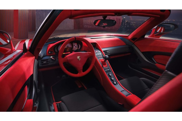 Als Kontrast kommt mattes Carbon zum Einsatz, etwa bei den Sitzschalen, den Luftdüsenblenden und der Instrumentenabdeckung. Die Sitzbezüge bestehen teilweise aus schwarzem, nicht brennbarem FIA-Textil, das auch im Porsche 918 Spyder verwendet wurde. Wie beim historischen 917 verfügt auch der Carrera GT über zwei Sitze.