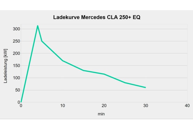 Die Ladeergebnisse sind generell sehr unterschiedlich. Auto-Bild erreichte im ersten Ladeversuch nur 158 kW, obwohl der Akku vorkonditioniert war und kein anderes Auto am gewählten Standort geladen wurde. Der Grund dafür blieb unklar. Möglicherweise lag es an einer zu hohen Akkutemperatur; diese wird im CLA angezeigt, aber die Kollegen haben sie nicht dokumentiert.
