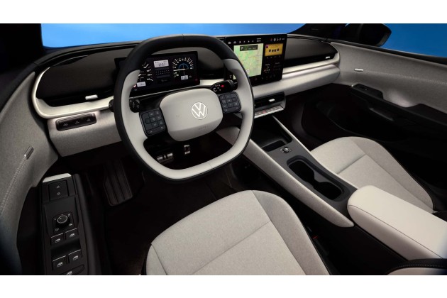 An den Türinnenseiten sind die silbrigen Türöffner aus dem neuen T-Roc zu erkennen. Statt mit drei Knöpfen wie beim ID.3 werden die elektrischen Fensterheber wieder mit vier Tasten gesteuert. Die Armaturentafel ist mit hellgrauem Stoff bespannt, der vage an den Wollstoff im Volvo EX30 erinnert. Ebenfalls neu ist die weiße Ziernaht an den Tür-Innenseiten, die am vorderen Ende in eine kleine "Volkswagen"-Plakette ausläuft.