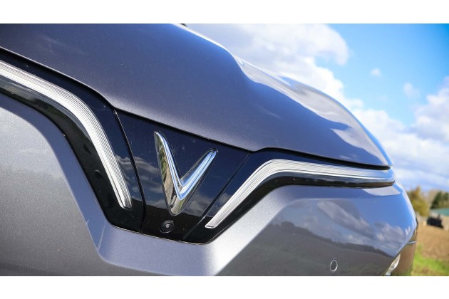 Ich bin keine Freundin von super schlanken Scheinwerfern. Das nimmt Autos oft ein dominantes Charaktermerkmal. Und so wirkt der Vinfast VF6 mit seinen langgezogenen Bändern, die mittig in V-Form zusammenlaufen, als würde er ein gepflegtes Nickerchen halten. Interpretieren wir die Lage also neu: Stellen Sie sich die großen Augen aus dem Film "Cars" auf der Frontscheibe vor: Nun schmunzelt der Vietnamese freundlich.