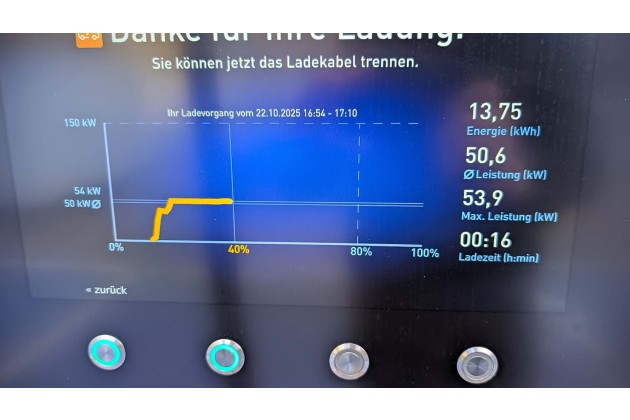 | DC-Ladegeschwindigkeit / 10 - 70 Prozent | ca. 1,4 kWh/min / 25 Minuten |