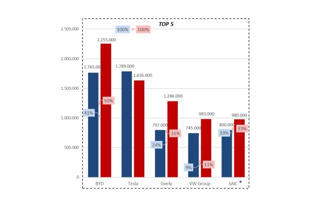 Der VW-Konzern steigerte seine Elektroauto-Verkäufe um 32 Prozent auf 983.000 Stück. Die VW Group lieferte sich ein Kopf-an-Kopf-Rennen mit der SAIC Group, die nach CAM-Schätzungen auf ähnliche BEV-Absätze kommt. Bei Volkswagen stieg der Anteil der BEVs an den Gesamtverkäufen von 9 auf 11 Prozent.