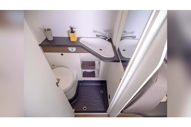 Das Variobad bleibt dem bekannten VANTourer-Stil treu. Eine schwenkbare Wand ermöglicht die Nutzung von Toilette, Waschbecken und Dusche auf engem Raum. Die Lösung ist nicht neu, aber bewährt und im Alltag oft praktikabler als großzügig beworbene Wellnesskonzepte. Selbst zusätzlicher Stauraum für Handtücher oder Pflegeutensilien findet noch Platz.