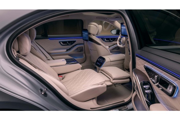 Neu im Fond sind zwei abnehmbare MBUX-Fernbedienungen mit denen man Fahrzeugfunktionen wie Klimatisierung und Sonnenschutzrollos sowie die nun größeren 33,3-Zentimeter-Displays hinter den Vordersitzen bedienen kann. Die Bildschirme verfügen zudem über integrierte HD-Kameras und eignen sich damit für geschäftliche Videokonferenzen mit Microsoft Teams, Zoom oder Webex.