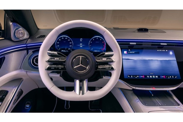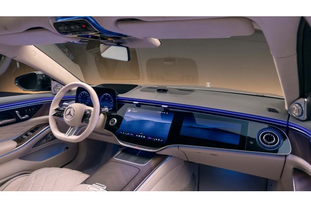 Anders als beim Hyperscreen im EQS, wo auch der Tacho unter Glas ist, steht hier das 12,3-Zoll-Fahrerdisplay (optional mit 3D-Effekt) weiterhin frei. Daneben verschmelzen das 14,4-Zoll-Zentraldisplay und der 12,3-Zoll-Beifahrerbildschirm unter einer durchgehenden Glasfläche. Damit einher geht eine völlig neue Architektur der Lüftungsdüsen. Statt der vier runden Düsen oben gibt es nun ein breites Lamellenband, das sich bis in die Türen zieht.