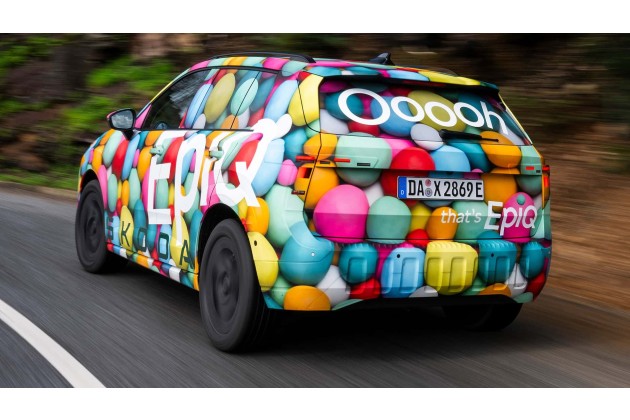Skoda zeigt erste offizielle Bilder des neuen Epiq, wenn auch in bunter Tarnung. Neue Informationen zu dem Kleinwagen oder kleinen SUV gibt es nicht; der Hersteller schreibt nur, man werde bald mehr zeigen.