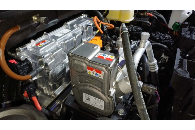 Wir sahen unter die Fronthaube und stellten fest, dass der Inverter senkrecht steht. Den Grund für diese ungewöhnliche Lösung kennen wir bisher nicht. In der Mitte des Motorraums ist der Klimakompressor auf einem Gummilager positioniert, wodurch verhindert wird, dass sich seine Vibrationen auf das Auto übertragen.
