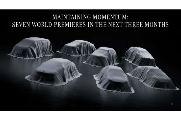 Bei seinen Geschäftsberichten zeigt Mercedes traditionell ein Chart mit den kommenden Modellvorstellungen. Das bringt uns jedes Mal zum Spekulieren, welche Modelle sich hinter den kleinen Icons verbergen könnten. Außerdem gibt uns die Übersicht Gelegenheit, die Vielzahl von Ankündigungen, Erlkönigen und Teasern zu einem möglichst stimmigen Bild zusammenzufügen. Ziemlich klar ist für uns, dass der GLA EQ, die elektrische C-Klasse, der AMG GT 4-Türer und der VLE in den nächsten Monaten präsentiert werden. Alles Weitere ist noch mehr oder weniger unsicher, zumal sich die Mercedes-Pläne auch wieder ändern können.