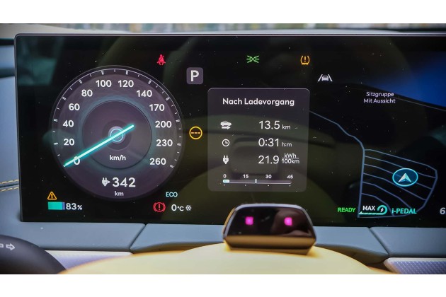 Im Innenraum werden die ursprünglich zwei Displays jetzt nicht mehr durch eine Blende getrennt. Das 27-Zoll große Doppeldisplay kann für ausgewählte Anzeigeoptionen auch durchgängig Grafiken zeigen und nutzt den gewonnenen Raum besser aus als sein Vorgänger. Insgesamt läuft das System Hyundai-Motor-Group-typisch flüssig und übersichtlich. Zudem kommt jetzt ein Drei-Speichen-Lenkrad statt eines mit zwei Speichen zum Einsatz.