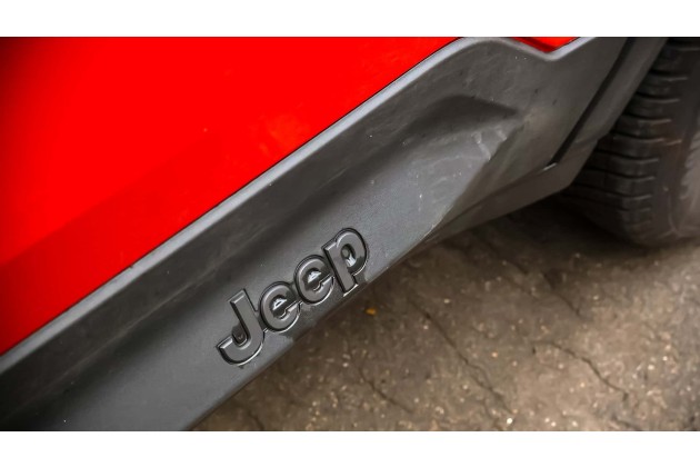 Bleiben wir auf der Seite, fällt vor allem die üppige robuste Beplankung aus kratzfesten Materialien auf. Die Radkästen erfahren eine kräftige Betonung, zudem sind sie in der Jeep-typisch abgeflachten Form oberhalb der Räder gehalten. Gegenüber der Serie gönnt sich der 4xe zudem noch einmal zehn Millimeter mehr Bodenfreiheit. In Kombination mit den kurzen Überhängen sorgt das für mehr unbefestigte Freiheit.
