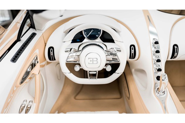 Auch die Räder greifen das Farbkonzept auf. Diamantgeschliffene Felgen erhielten eine speziell entwickelte Lackmischung, die das Zusammenspiel von Gold- und Weißtönen fortsetzt und die Lichtwirkung der Karosserie unterstützt. Im Innenraum setzt sich dieses Gestaltungsthema konsequent fort. Sämtliche Carbonflächen wurden weiß lackiert, wodurch ein kompakt wirkendes Cockpit mit starkem Fokus auf Materialwirkung entsteht. Türverkleidungen mit Linien in Weiß und warmem Gold folgen den konkav modellierten Flächen und betonen deren Geometrie.