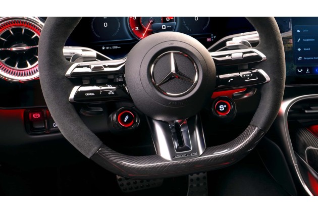 Das "AMG-Performance-Lenkrad" ist mit verschiedenen Bezügen erhältlich, von geschmeidigem Leder über leichtes Carbon bis hin zu rutschfester Mikrofaser. Das unten abgeflachte Steuer bietet rechts ein Bedienröllchen, links eine Wippe. Paddles dahinter ermöglichen die Einstellung der Rekuperation. Mit zwei runden Knöpfen weiter unten werden offenbar die Stoßdämpfer und die Fahrmodi eingestellt. Die gewählte Einstellung wird auf dem Display angezeigt, das direkt in die jeweilige Taste integriert ist.