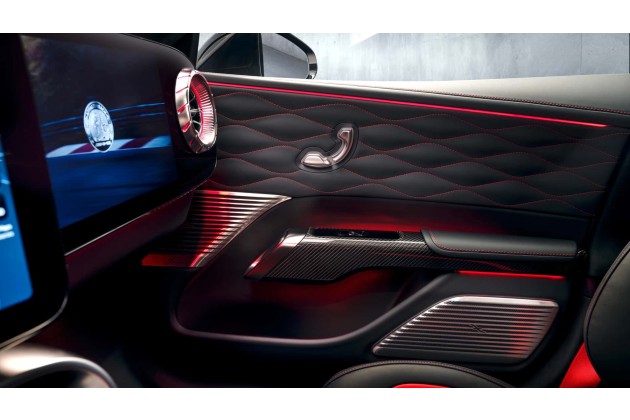 Die erwähnten Luftdüsen im Turbinen-Look an beiden Enden des Armaturenbretts fügen sich in die Glasoberfläche ein. Als Teil der Ambientebeleuchtung leuchten sie in wählbaren Farben. Die Mittelkonsole im Carbon-Look umfasst eine Armlehne, ein geschlossenes Staufach, zwei Ladepads zum kabellosen Handy-Laden sowie zwei beleuchtete Getränkehalter.