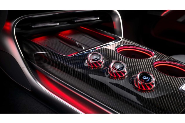 Mit den drei Drehknöpfen werden Gasannahme, Traktion und Kurvenverhalten gesteuert. Mit dem Regler für "Response Control" stellt man die Reaktion der Elektromotoren auf die Gaspedalstellung ein. Mit dem Knopf für die "Agility Control" verändert man das Kurvenverhalten und mit dem "Traction Control"-Knopf lässt sich die Traktionskontrolle in neun Stufen einstellen. Die drei Drehknöpfe sind mit ihrer Beschriftung auf den Fahrersitz ausgerichtet und greifen das Design der turbinenartigen Luftausströmer auf.