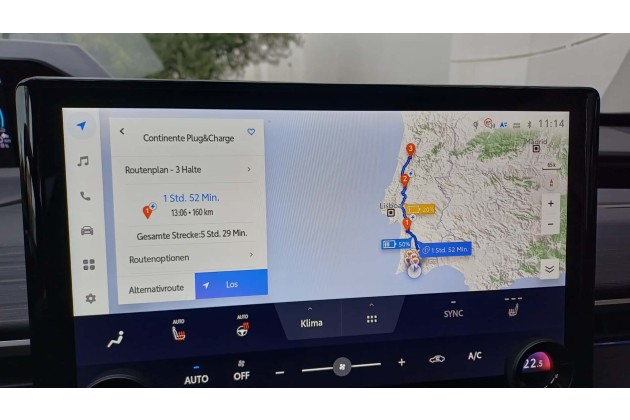 Auch die Laderoutenplanung litt offenbar unter der fehlenden Internetverbindung. Sie zeichnete immer ein, an welcher Stelle der Route 50 und 20 Prozent Ladestand (SoC) erreicht sind. Auf Verlangen werden auch Schnelllader eingetragen, aber um konkrete Empfehlungen handelt es sich dabei nicht. Sagen andere Elektroautos einem, dass man zum Beispiel an einer bestimmten Ladestation von Endesa von 10 auf 70 Prozent laden soll, gab es beim getesteten C-HR+ nichts dergleichen. Man kann auch weder den Mindest-Ladestand festlegen, bei dem man am Lader und am Ziel ankommen möchte, noch die Ladeanbieter oder die Mindest-Ladeleistung einstellen.
