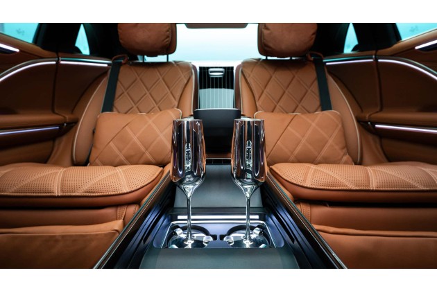 Für das standesgemäße Luxus-Erlebnis im Fond bleiben die versilberten Champagnerkelche von Robbe & Berking sowie das 10-Liter-Kühlfach optionale Pflicht-Features.