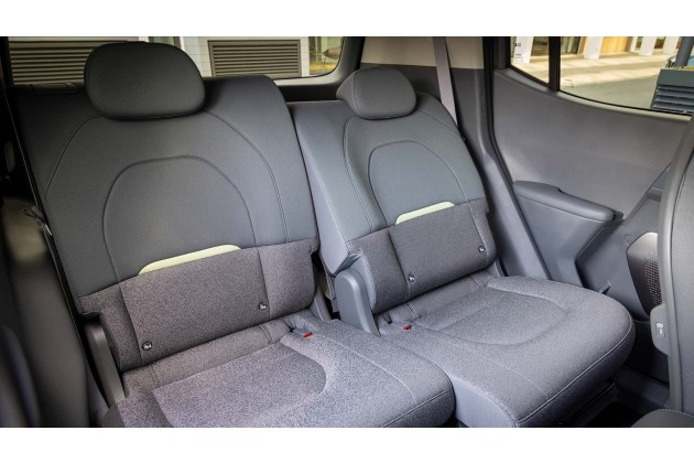 Das Verzichten auf eine hohe durchgängige Mittelkonsole sorgt für reichlich Luft. Das schlanke horizontal ausgerichtete Armaturenbrett streckt den EV2 in der Breite. Gerade in der von uns gefahrenen Viersitzer-Variante kann über die verschiebbare Rückbank der Platz individuell auf Mitfahrende oder Gepäck ausgerichtet werden. Das schafft in beide Richtungen massig Komfort. Allerding bedingt der hohe klobige Aufbau eine eingeschränkte Rundumsicht.