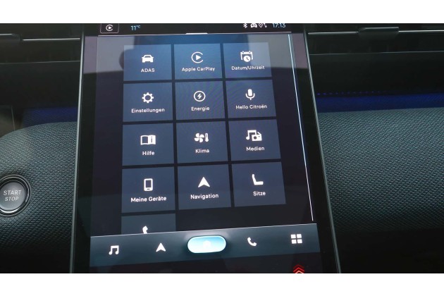 Die Bedienung des ë-C5 Aircross ist eine interessante Mischung aus gelungen und halbfertig. Das Grundlayout überzeugt. Der 13 Zoll große Waterfall-Screen reagiert flott, die Klimafunktionen sind dauerhaft im unteren Bereich eingeblendet. Darunter sitzt eine echte Tastenleiste für Front- und Heckscheibenheizung, Gebläse sowie die große ADAS-Taste.