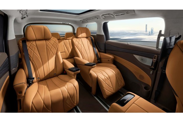 Besonderes Augenmerk liegt auf der zweiten Reihe. Die sogenannten Air-Spa-Zero-Gravity-Sessel bieten 14-fach Verstellung, 16-Punkt-Massage und lassen sich bis 152 Grad zurücklehnen. Zusammen mit ausklappbaren Tischen an den Rückenlehnen der Vordersitze entsteht ein vollwertiger Arbeitsplatz oder ein komfortabler Ruheplatz auf längeren Etappen. Mehrere Sitzmodi erlauben die Wahl zwischen maximalem Beinraum für vier Personen oder voller Bestuhlung mit erweitertem Laderaum.