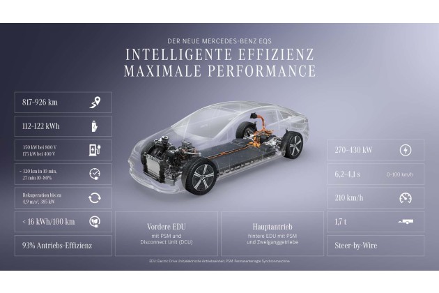 Die um 13 Prozent gesteigerte Reichweite des EQS 450+ wurde durch eine größere Batterie und verbrauchssenkende Maßnahmen möglich. Die Speicherkapazität der bisher 118 kWh großen Batterie erhöhte sich dank verbesserter Zellchemie auf 122 kWh - das sind drei Prozent mehr. Dazu kommen Graphitanoden mit beigemengtem Siliciumoxid zum Einsatz; das erhöht die Energiedichte. Der Anteil von Cobalt in den Kathoden konnte reduziert werden.
