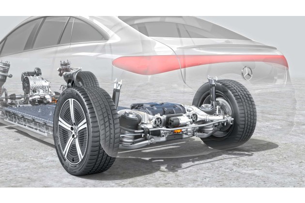Eine technisch interessante Neuerung ist auch die Dämpferregelung des Luftfahrwerks: Das System greift auf Car-to-X-Informationen von vorausfahrenden Mercedes-Fahrzeugen zu. Damit wird erkannt, dass der EQS auf eine Unebenheit wie vor allem eine Temposchwelle zufährt. So können sich die Dämpfer rechtzeitig darauf einstellen. Die Technologie wurde von Mercedes selbst entwickelt und zum Patent angemeldet.