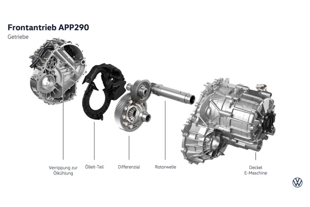 1-Gang-Getriebe samt Gehäuse und der ebenfalls neu entwickelte Pulswechselrichter. Der Klimakompressor wurde aufwendig von der Karosserie entkoppelt und soll laut VW keine Vibrationen in den Innenraum übertragen.
